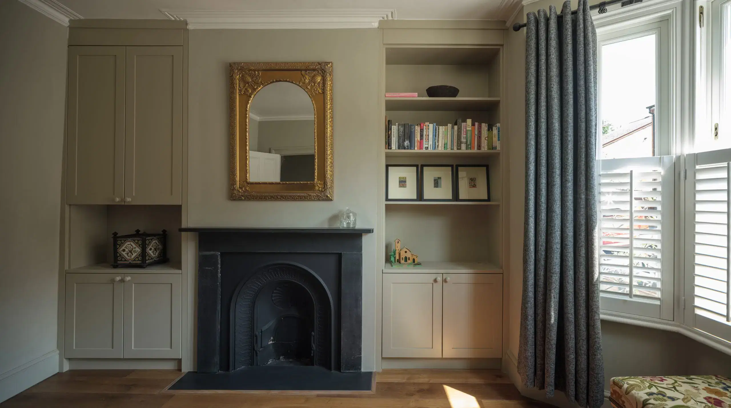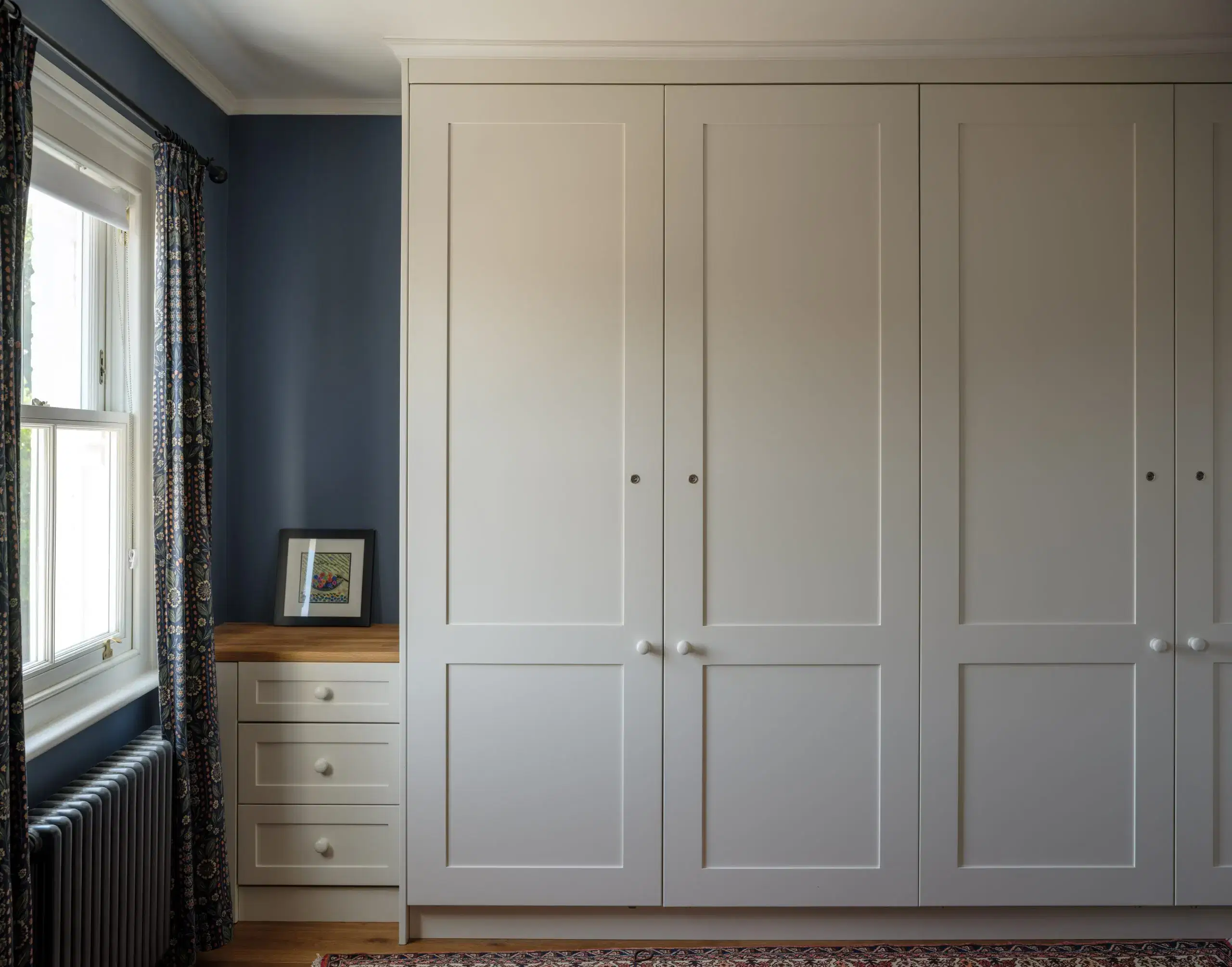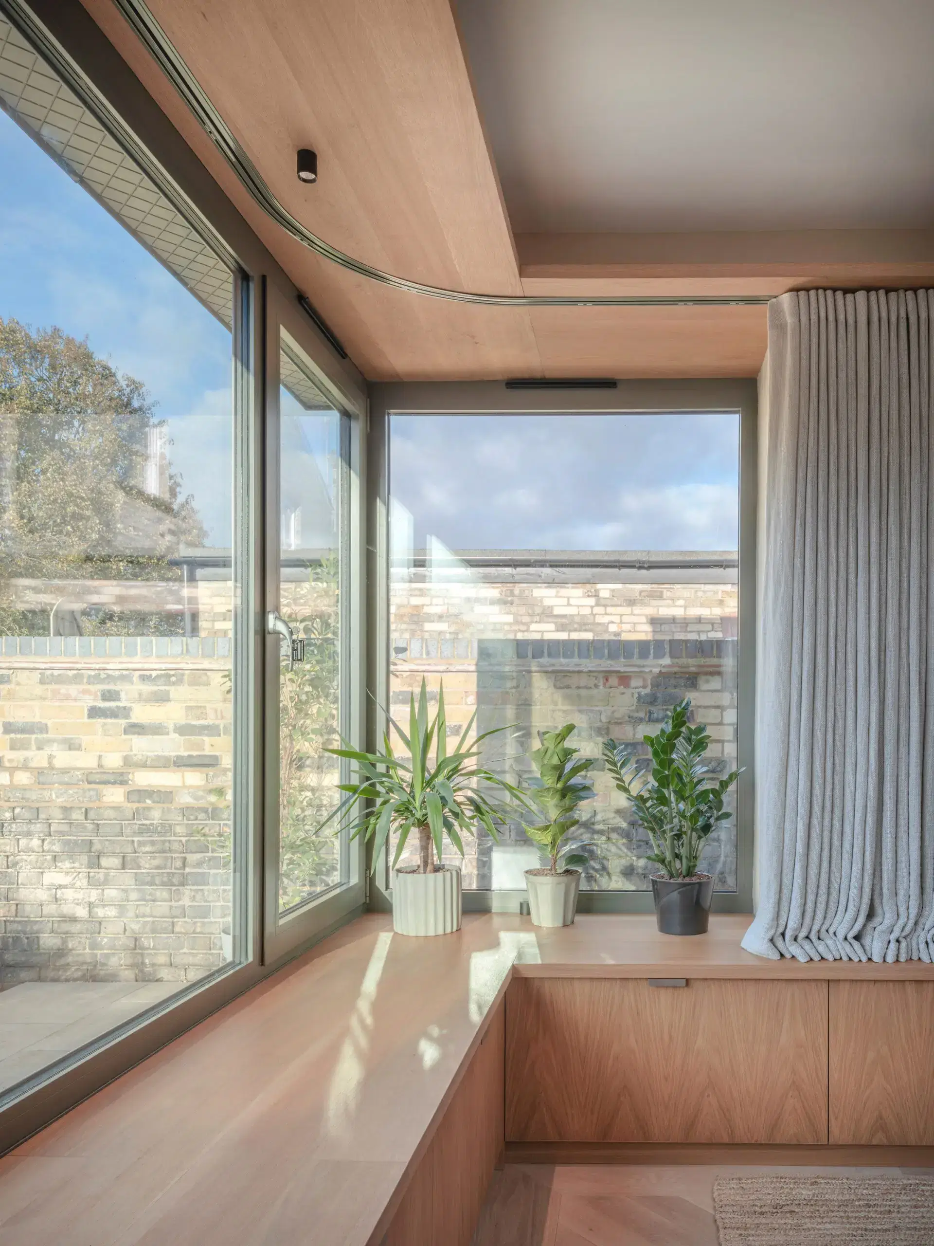 On the inside of this corner window a cleverly designed Oak cupboard space was built around the shape of the window to provide both storage space and additional seating. Above the window a curved shelf incorporates the curtain rail and clever lighting. Â