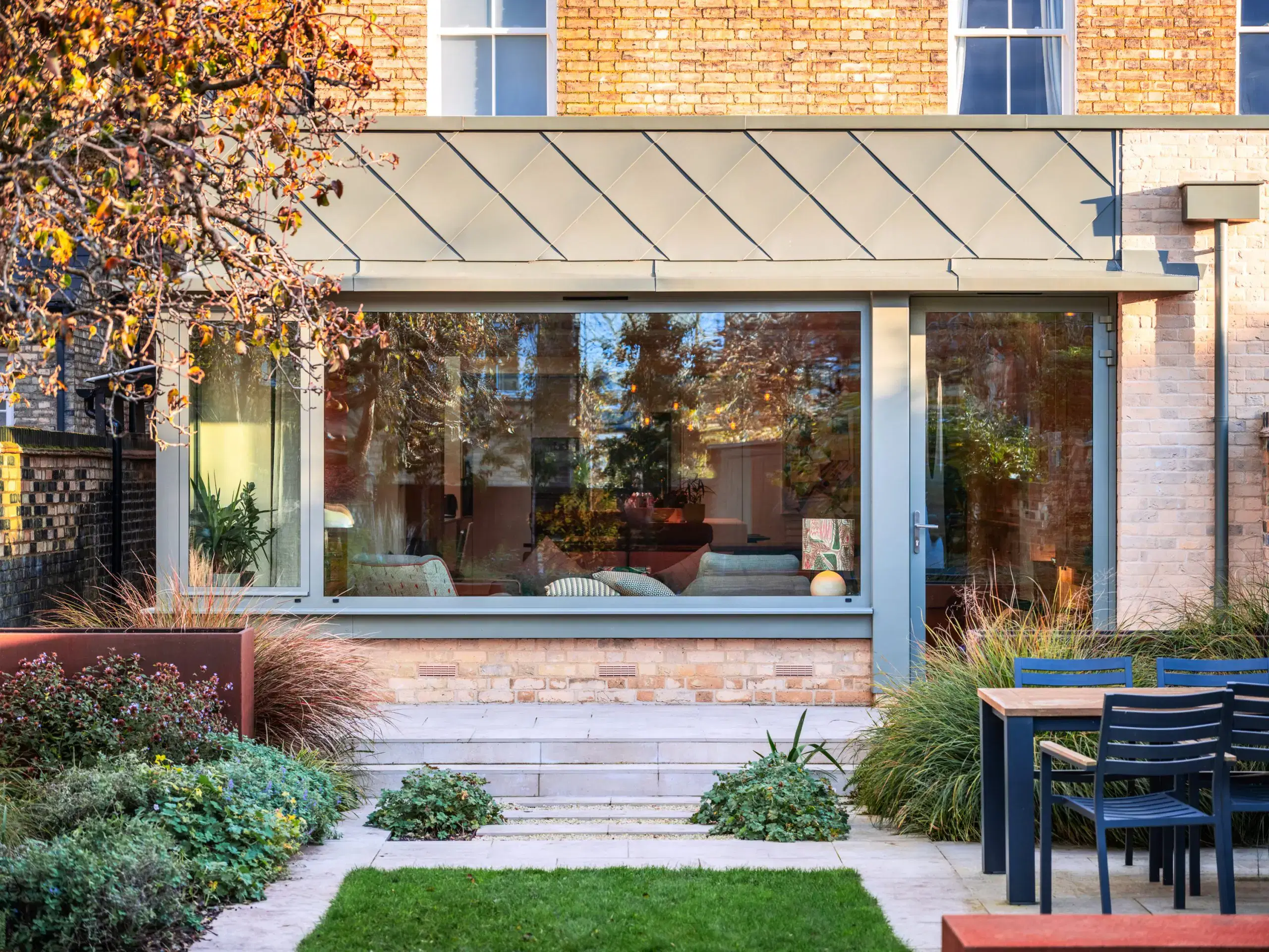 A large aluminium corner window and single door were supplied by Law & Lewis Ltd, powder coated in RAL 7003 matt finish. The glazing was upgraded to sunscreen glass to keep the room cooler. This wide window and single door give a clear, uninterrupted view to the beautiful garden.