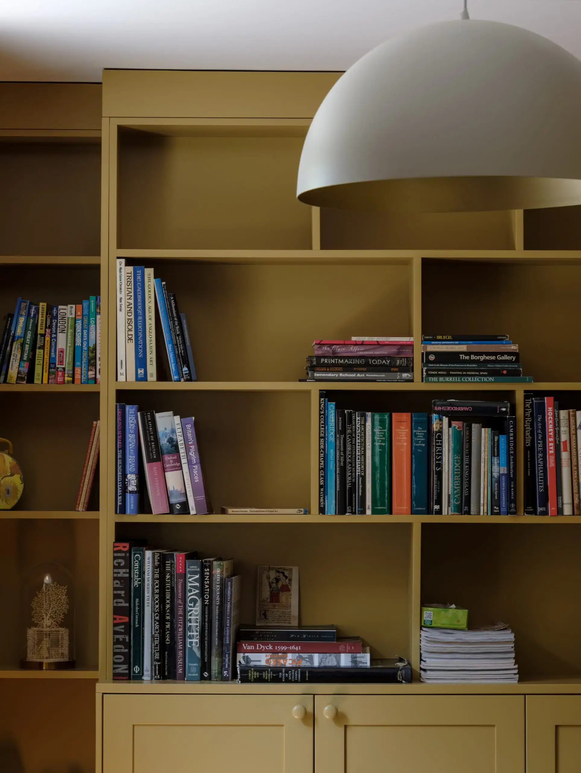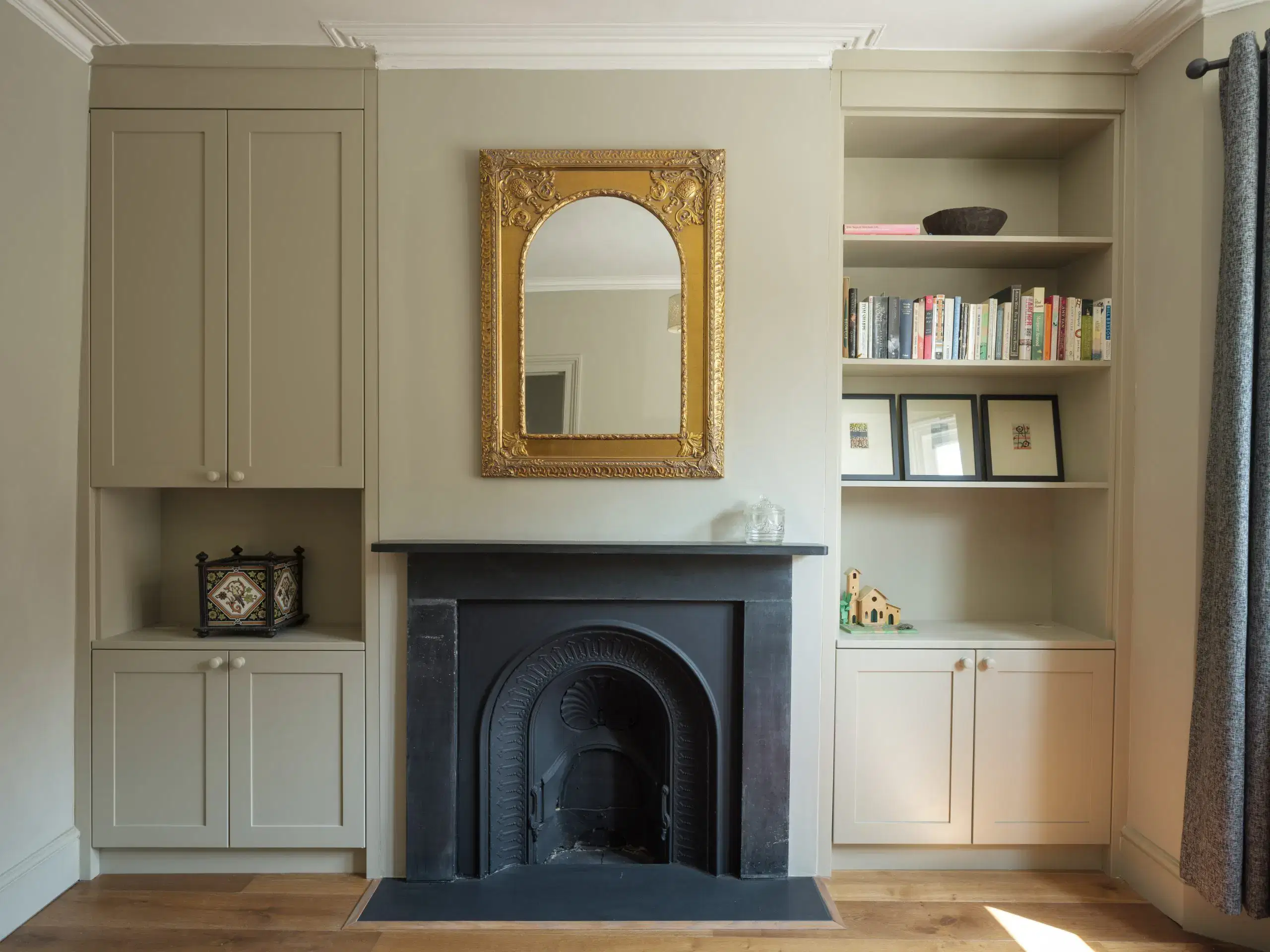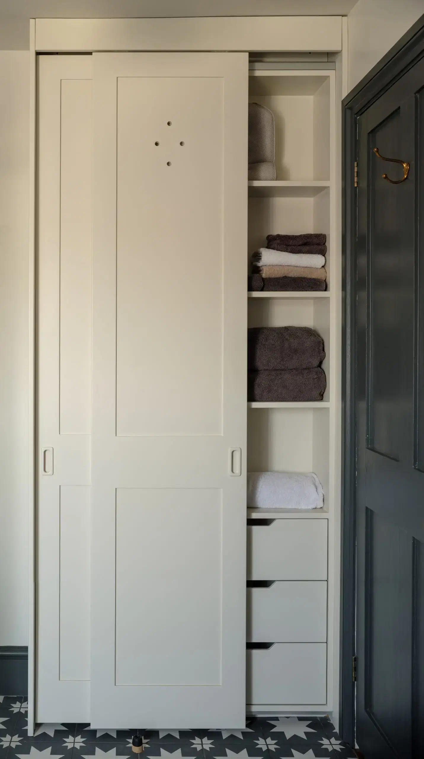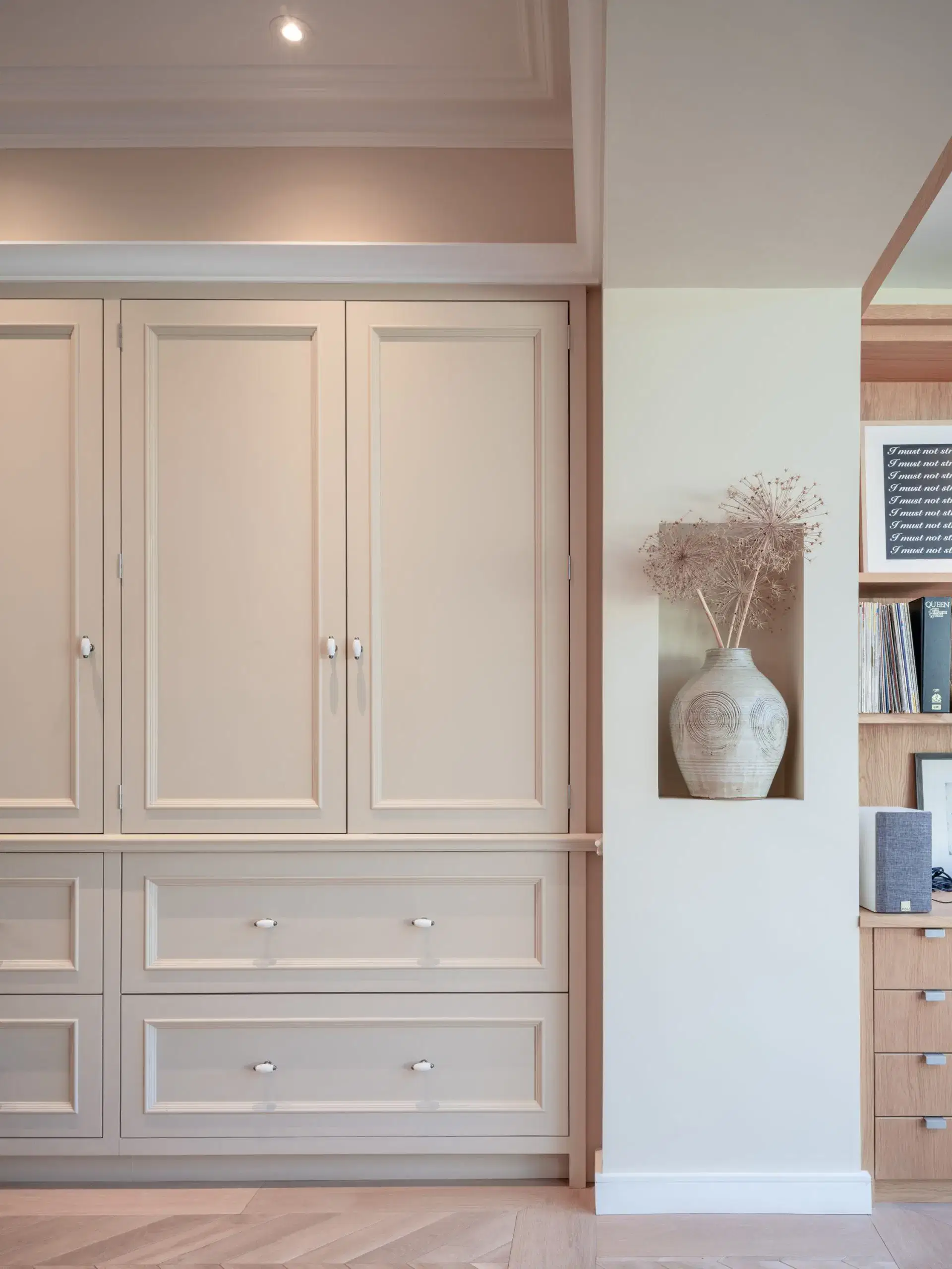 In addition, built in joinery, painted white to seamlessly blend into the wall provides extensive storage and shelves without dominating the room.