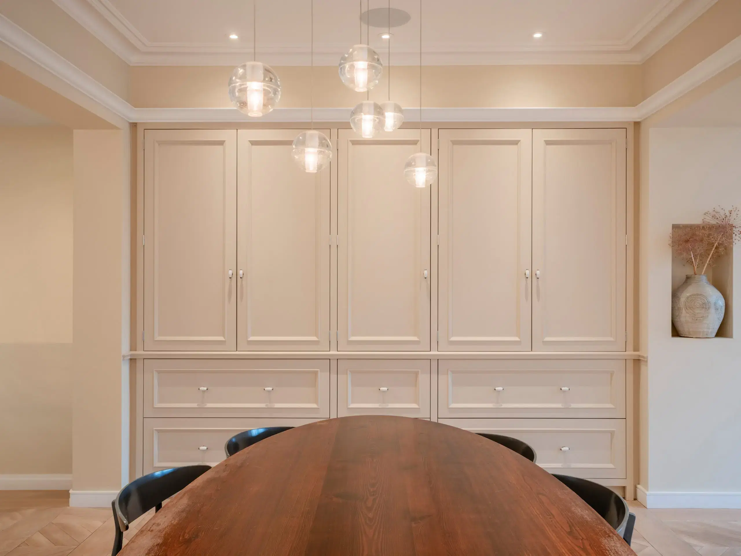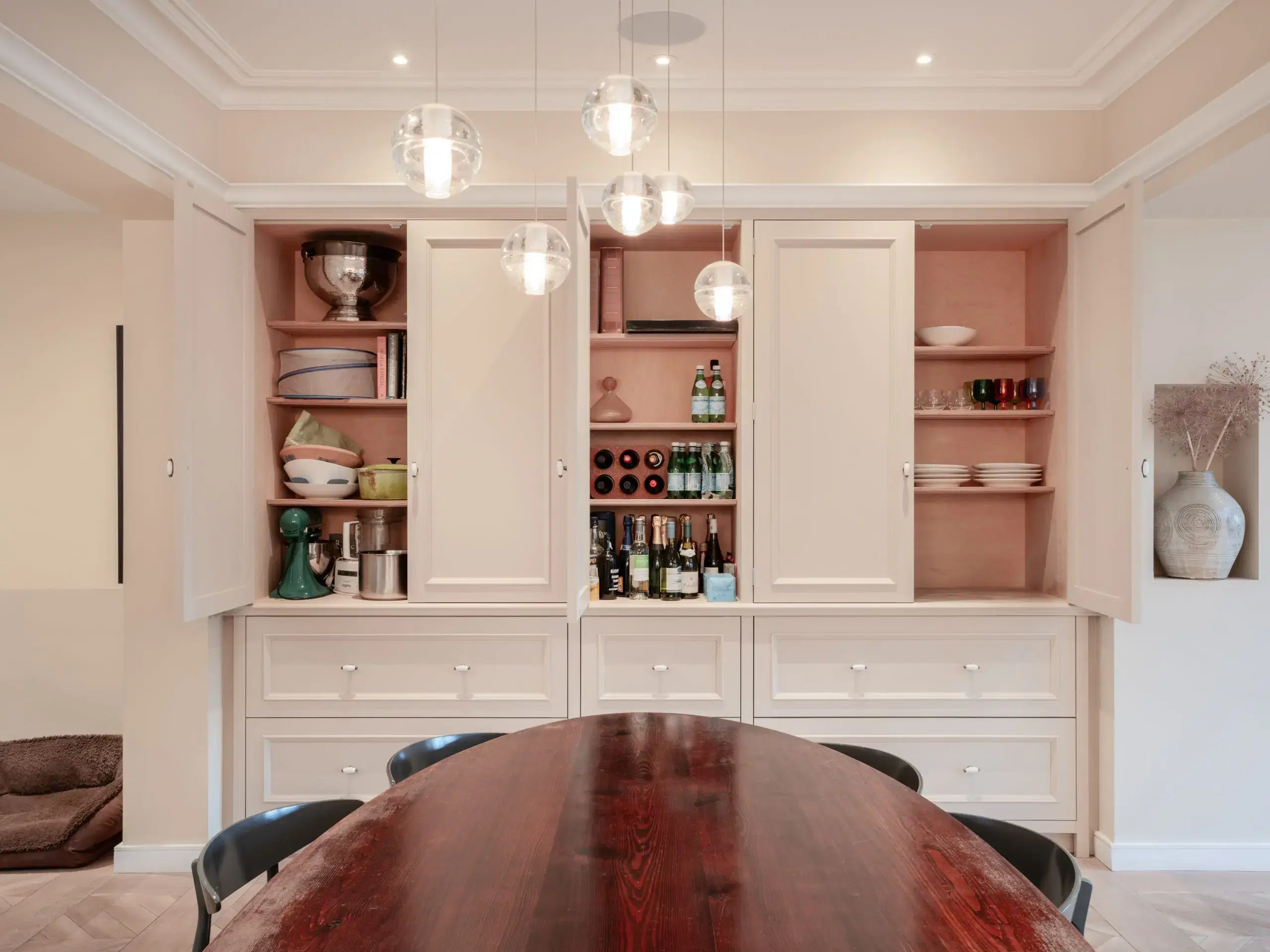 Moving back into the room the dining room cabinetry has been built in a different style and colour to create a separate zone.