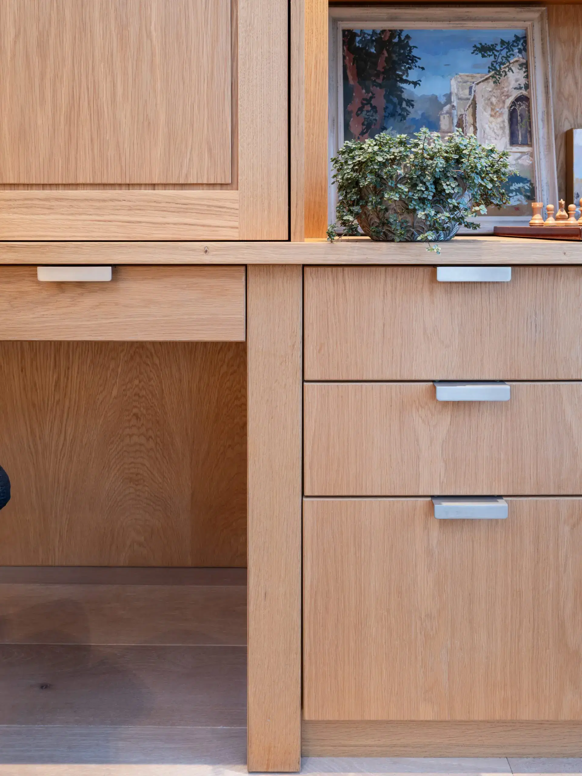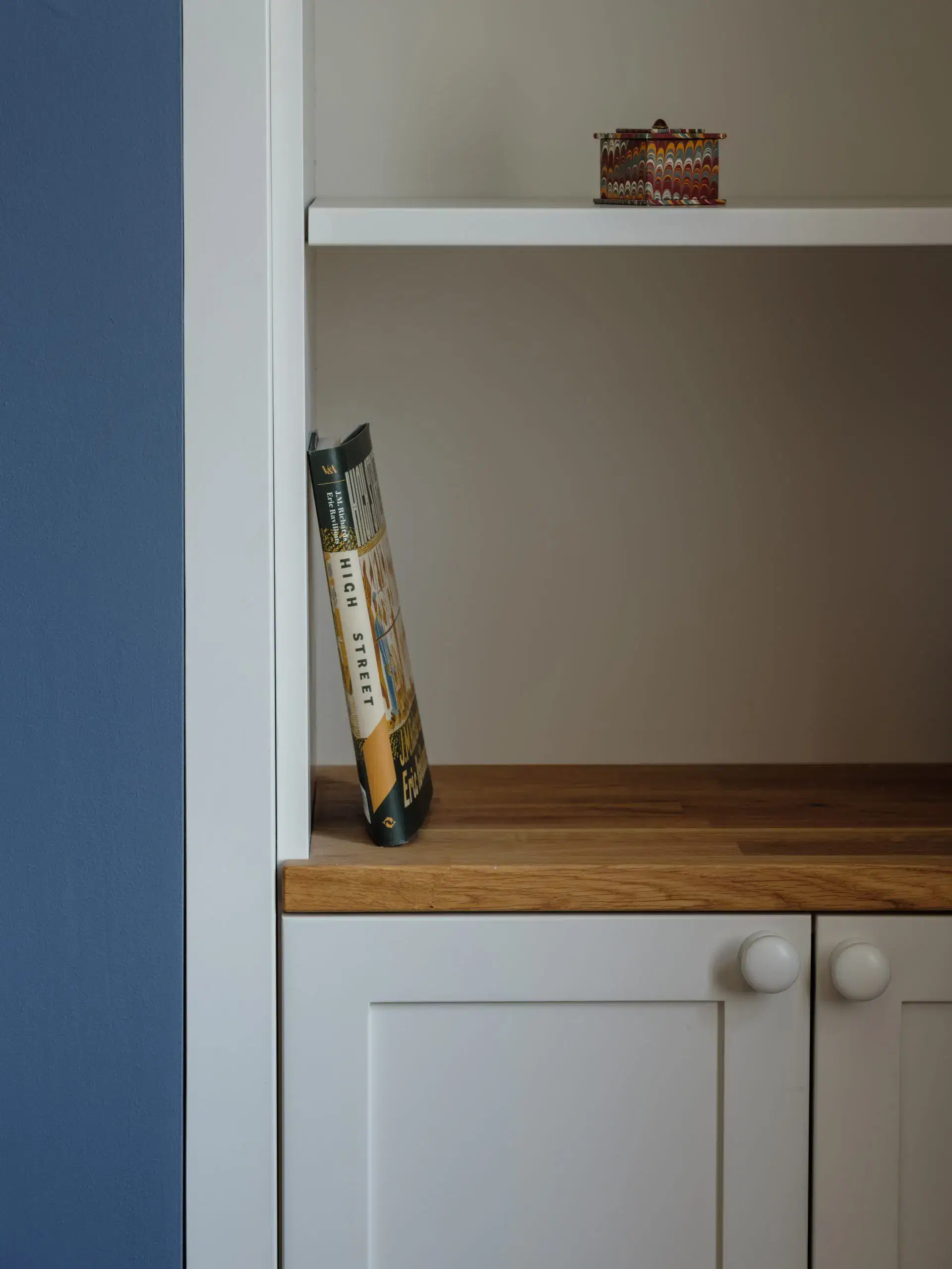 Matching the corner cabinetry is an office cupboard which opens when working but neatly closes to hide the work area leaving open shelves to one side which fits perfectly into the aesthetic of this area.
