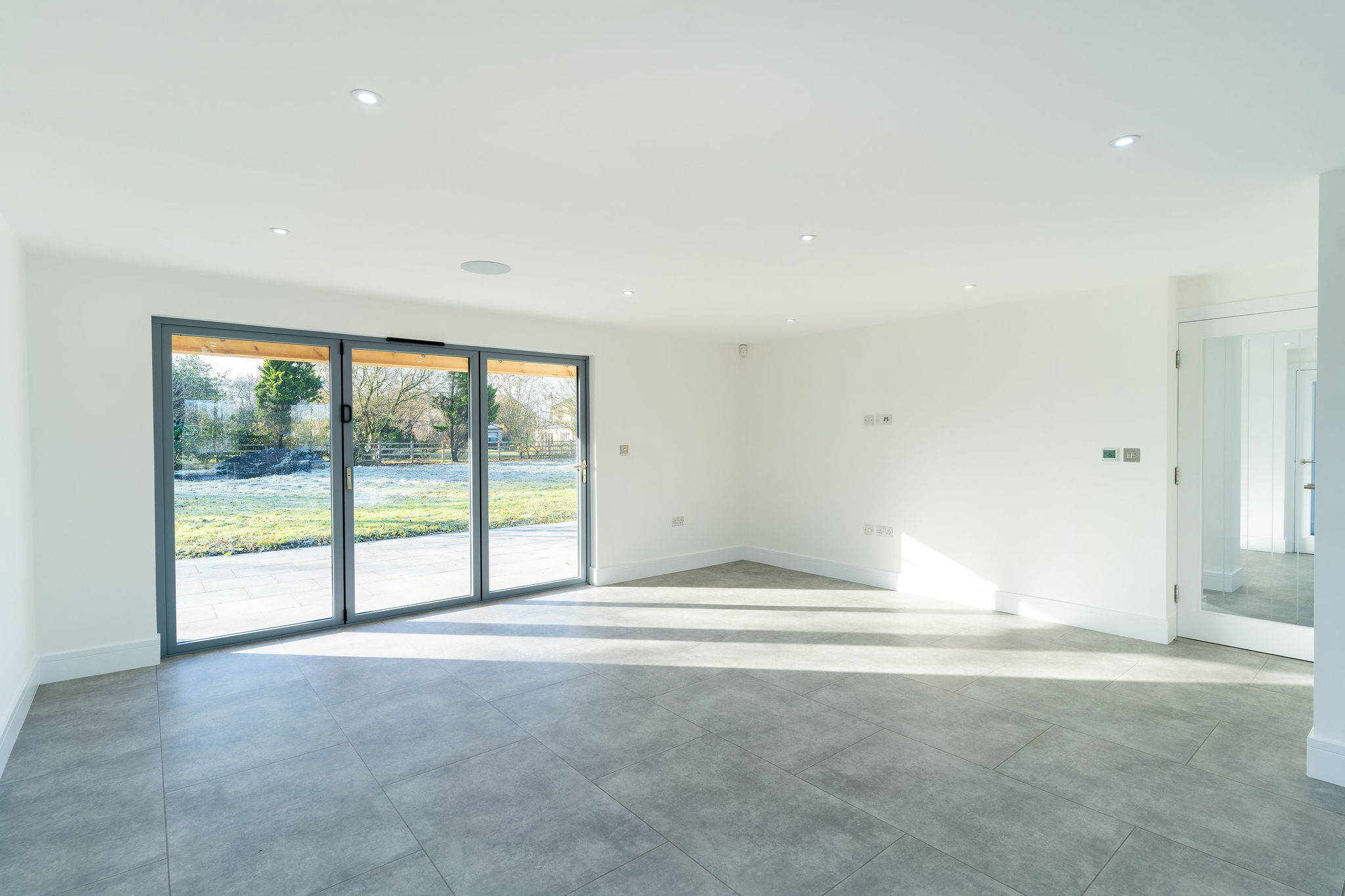 Law & Lewis provided the aluminium sliding doors to two elevations and an aluminium fixed panel on the return.  The larger sliding door comprised of 3 panels all sliding to one side and the smaller one a 2-door option. Fitted above the 3 door bifold, is large shaped fixed panel. All the aluminium was finished in RAL 7016 anthracite grey.